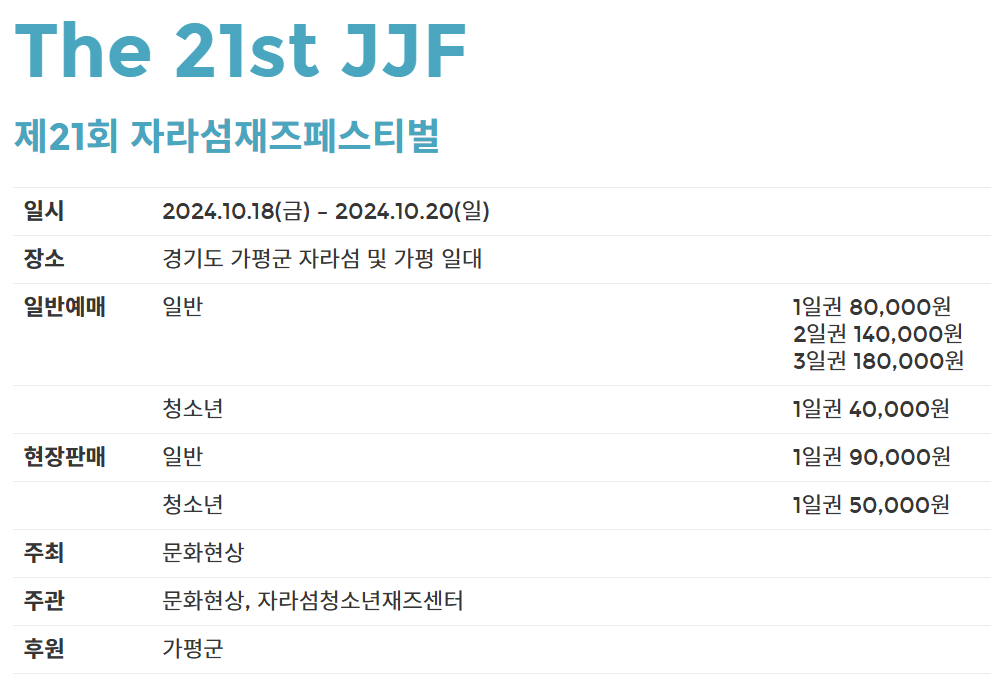 올해로 21회째를 맞는 이 축제는 국내뿐만 아니라 해외의 유명 재즈 뮤지션들도 참여하여 수준 높은 음악을 들려줍니다. 보통 10월 금요일에서 일요일까지 주말 2박 3일의 일정으로 진행되며, 올해는 10월 18일 금요일부터 20일 일요일까지 행사가 진행되었습니다.
